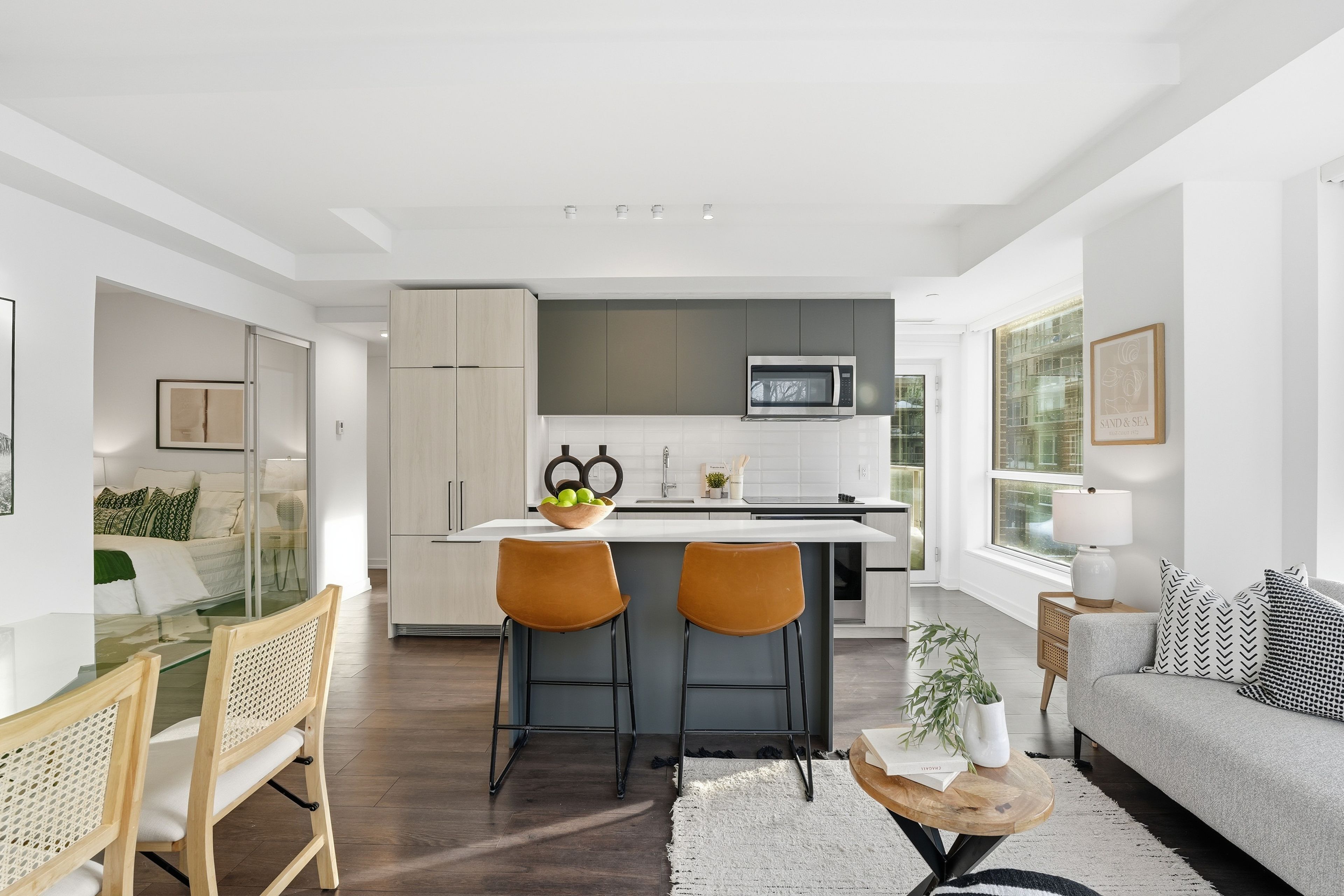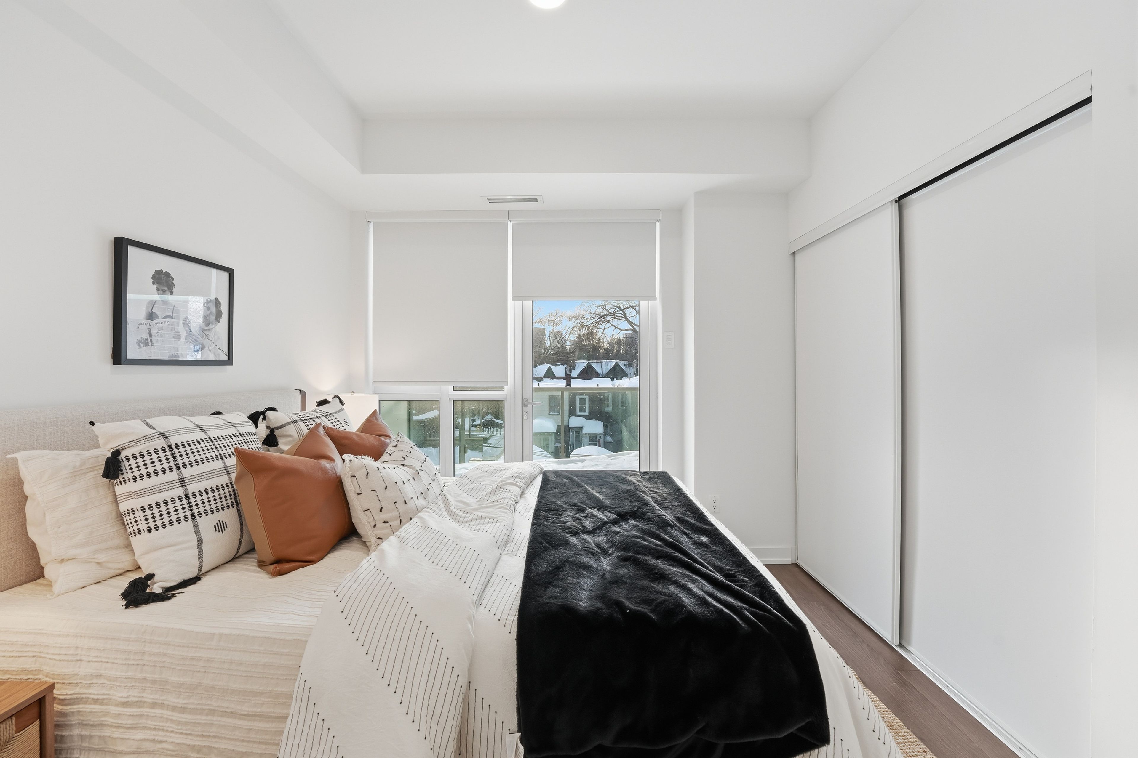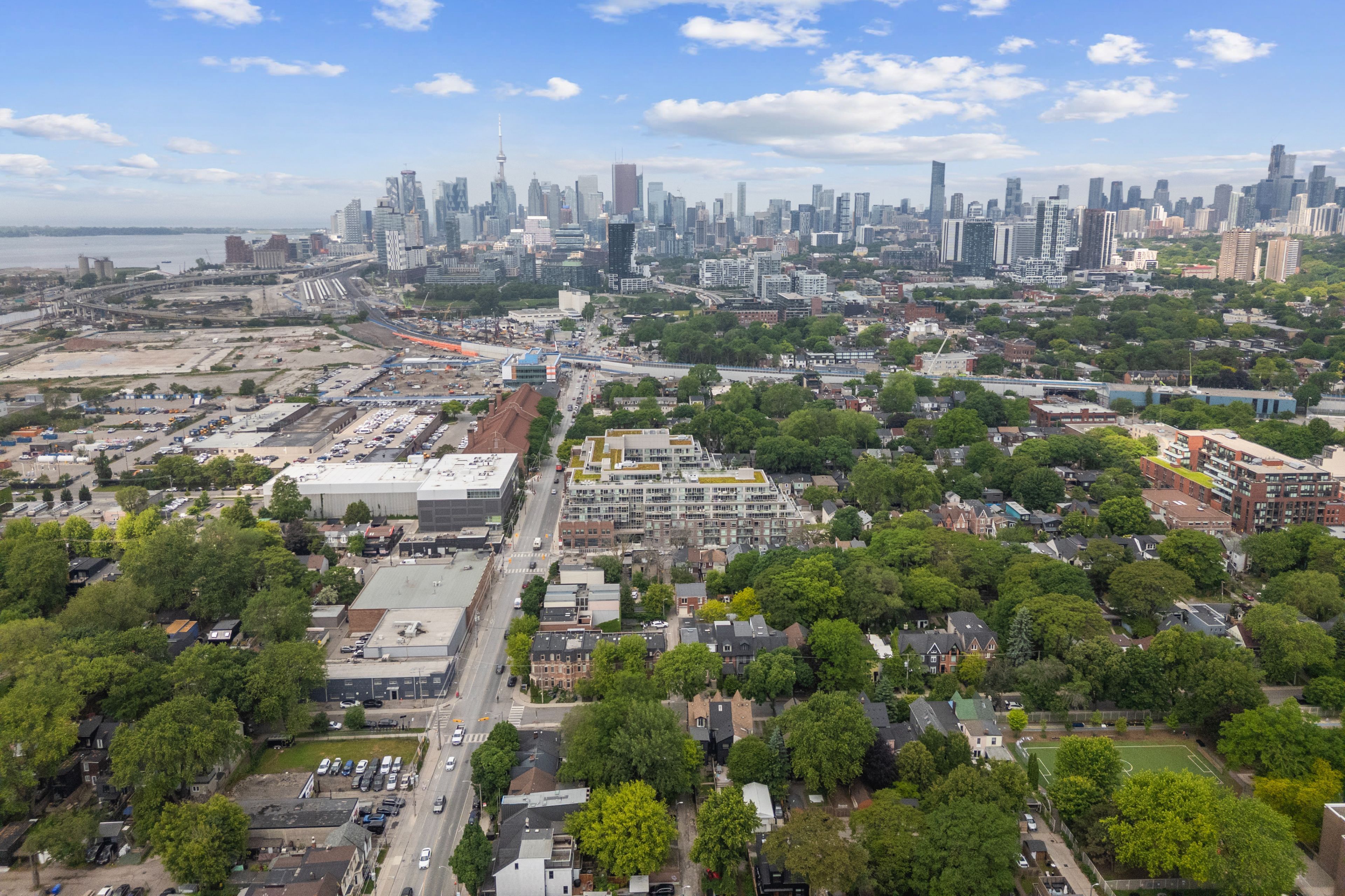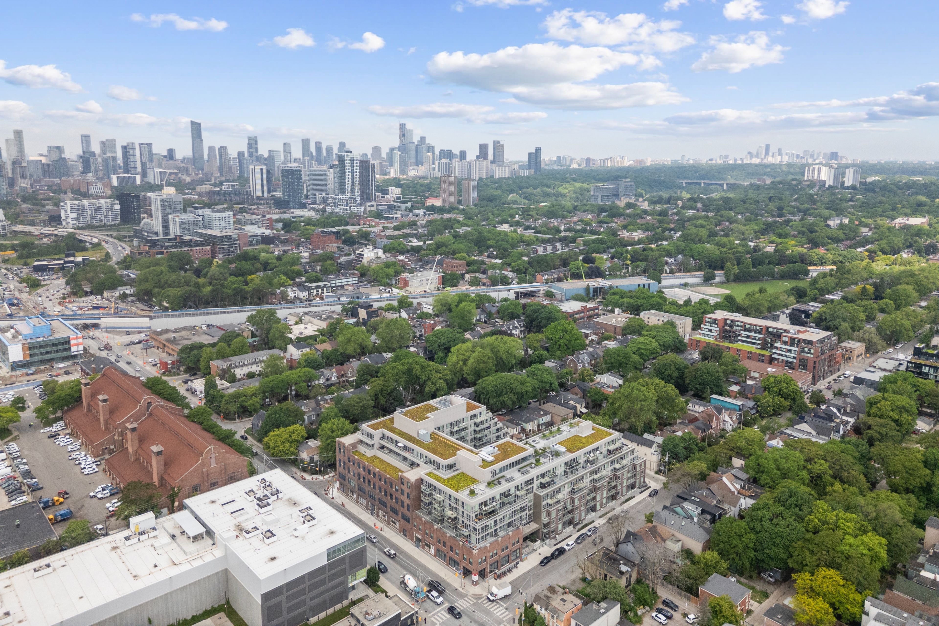 Stylish & quiet 3-bedroom, 2-bathroom corner suite with underground parking & locker in Leslieville's iconic Wonder lofts, formerly the historic Weston Bakery. Highly functional layout with 9 ft smooth ceilings, abundant natural light, and west-facing exposure with north and south exposures. Contemporary two-tone chef's kitchen features integrated stainless steel appliances, white quartz countertops, under-cabinet lighting, undermounted sink, and a generous island that doubles as a breakfast bar . Flint Oak wide plank laminate flooring throughout. Primary bedroom includes a 4-piece ensuite. Second bathroom is a 4-piece with a deep soaker tub. The second bedroom works beautifully as a spacious home office with glass sliding doors and great natural light. The third bedroom features north-facing windows with sunlight throughout the day and motorized blackout roller blinds. Remote-controlled day shade blinds are also installed in the living area, and blackout in primary bedroom. Enjoy world-class amenities including a rooftop deck with unobstructed views and BBQs, fire pit, gym, concierge, co-working space with WiFi, indoor family and children's playroom, pet wash, and bike storage. Unbeatable location just steps to the best stretch of Queen Street East, with top-tier restaurants, independent boutiques, lively patios, transit, and excellent schools nearby. Ideal for a work-from-home couple or a growing family. A rare blend of style, comfort, and urban convenience in one of Toronto's most dynamic neighborhoods. A must see!